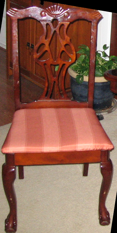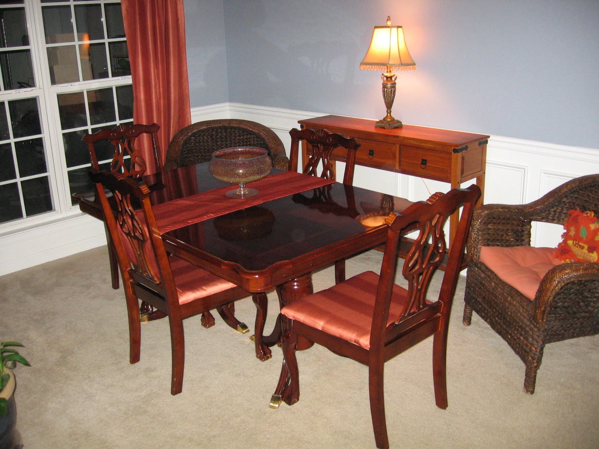 Damon and I upholstered our old chairs (you will be surprised how easy it was) with the fabric that matches the window treatments, rearranged the furniture and voila: in the picture below is our new and almost formal dining room.